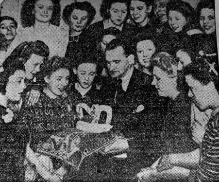 Potential Denaby & Cadeby Coal Queens inspect the crown, held by Councillor G Cheshire, at the pit’s Vesting Day Ball onNew Year’s Eve.