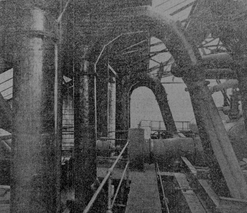 Top of the combustion chamber, showing the burners which load the pulverised full into the chamber and in the centre a secondary air flue