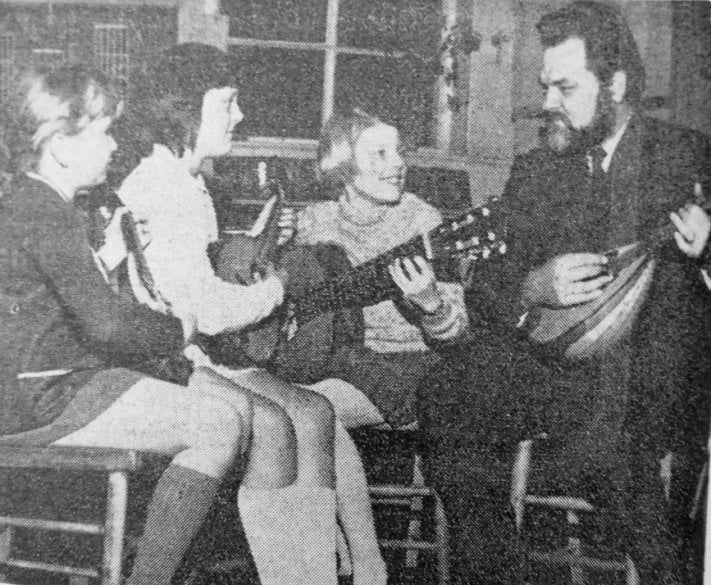Professor Richard Salzer, of the State University of New York, takes a lesson on the guitar from schoolchildren Carol Spooner, Susan Wood and Jane Carr when he visited Morley Place Junior School, Conisbrough on Wednesday.