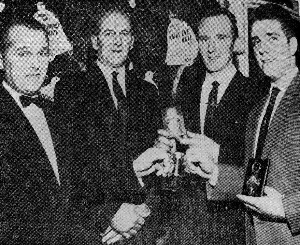 Mr. Peter Hinchliffe (President) presents the bowling and batting averages trophies to Doug. Swann (right) and the award for fielding to Eric Spyve (secretary), with Mr. Harry Chantry (Chairman) looking on. This picture was taken at the Old Denaby Cricket Club dinner at the Empress Ballroom, Mexborough, last Friday.