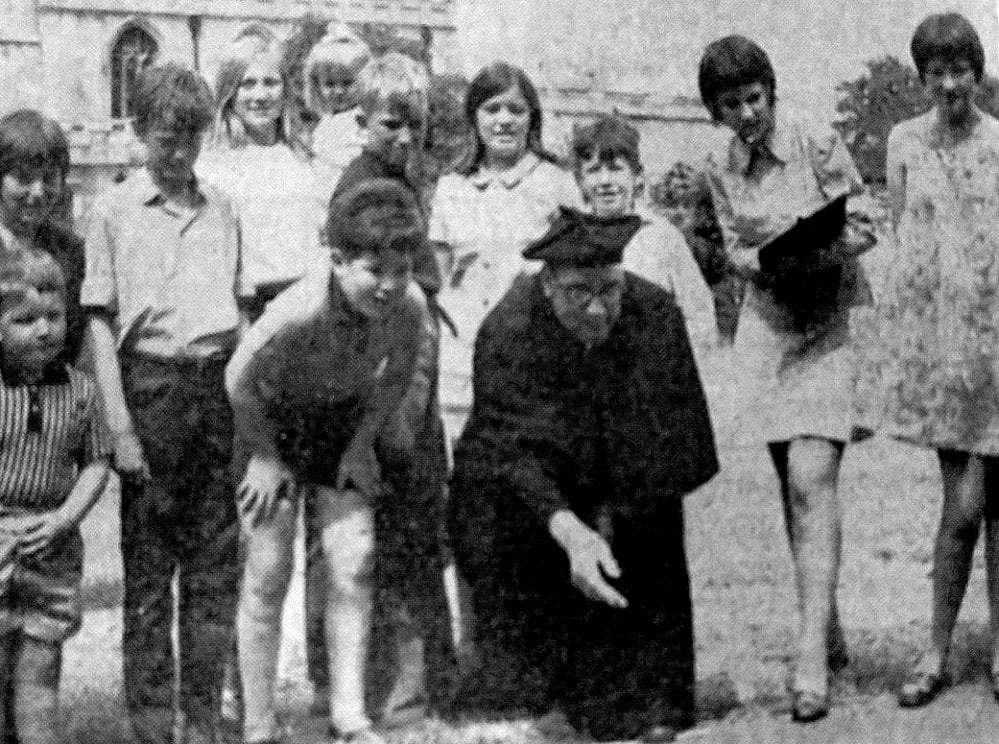 Canon.G. G. Braithwaite. Vicar of Conisborough, Joins in a game with the youngest visitors to the Parish Church’s Spring Fair on Saturday.