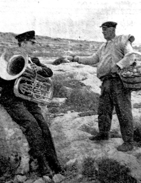 20-year-old John Webb, of Conisbrough, a member of the Lancs, Regiment band. Stationed at St Andrews barracks, Malta, is seen with 74 year old orange seller Mr Charlie Beheger, who at one time served with the Maltese artillery.