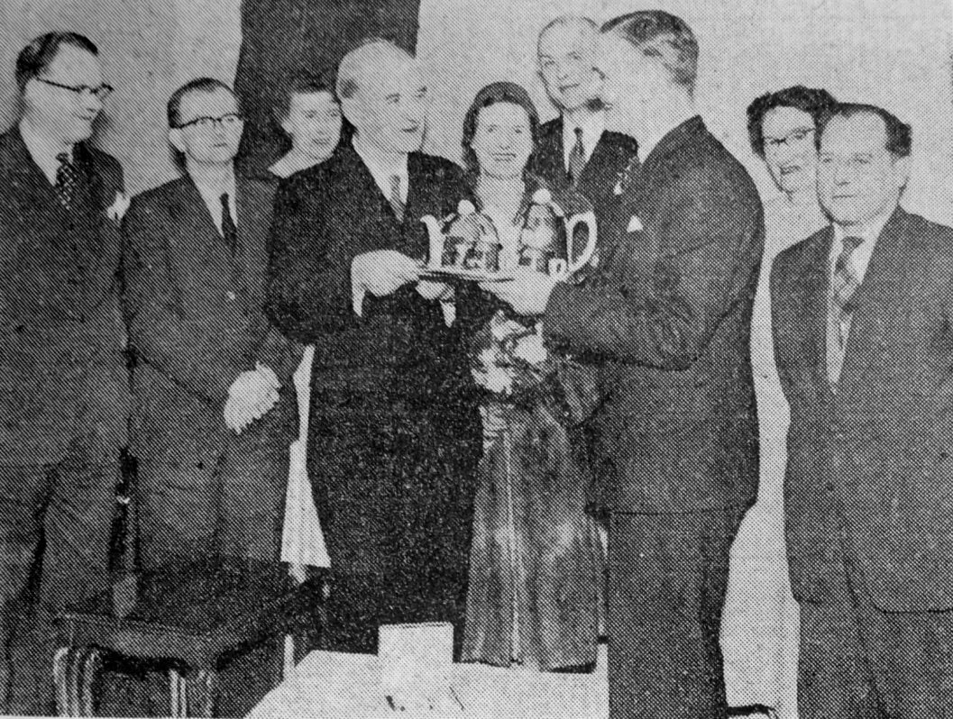 Mr. M. S. Wilson, Works Superintendent at the Westfalite Factory, Denaby Main, presents retiring manager, Mr. A. T. Tyre, with a nest of tables, tea service and electric shaving outfit, on behalf of I.C.I. employees.