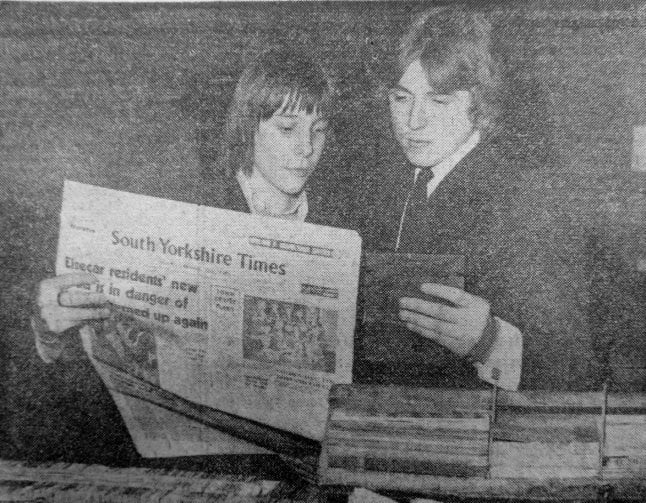While spending their week’s holiday from Conisbrough Northcliffe School at the “South Yorkshire Times” head office at Mexborough, Derek Taylor and Melvyn Holmes gain first-hand knowledge on the lay-out of the paper.