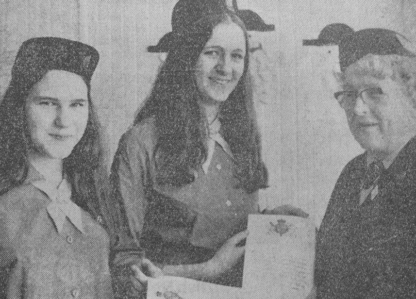 At a special meeting on Tuesday of the 33rd Rotherham (Conisborough) Girl guide company, Mrs. U. M. Bradley ( divisional commissioner for Rotherham) presented the Queen’s Guide Awards to Kathleen Heron (14), left, and Patricia Broad (14).