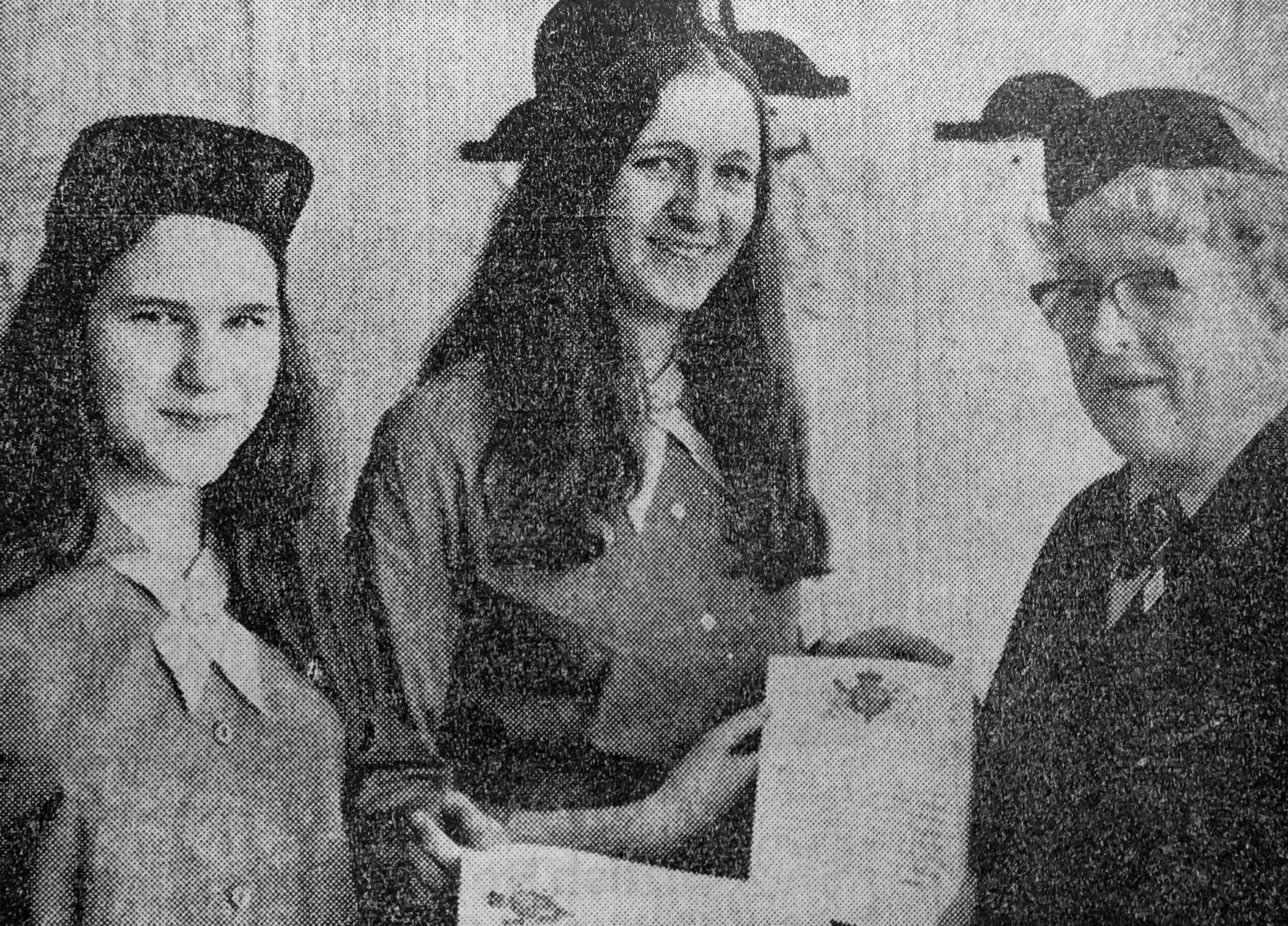 At a special meeting on Tuesday of the 33rd Rotherham (Conisbrough) Girl Guide company, Mrs. U. M. Bradley (Divisonal commissioner for Rotherham) presented Queens Guide Awards to Kathleen Heron (14), left, and Patricia Broad (14).