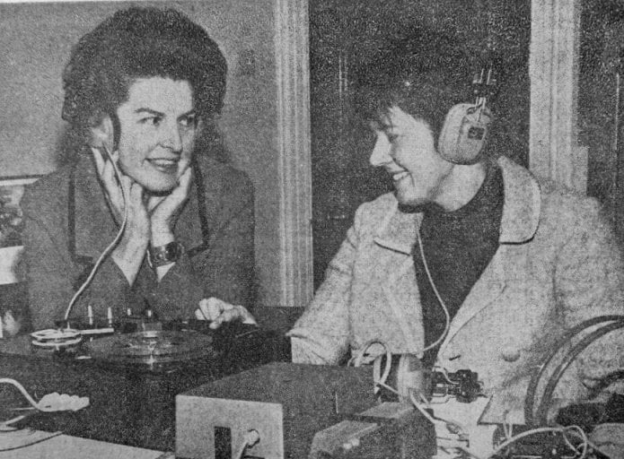 Miss Joan Lestor (Parliamentary Under-Secretary for Education and Science) with Caroline Hanson on the audio-visual tape-recording machine during her visit to Red House, Denaby, last Friday.