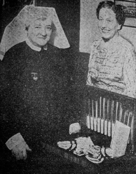 The Retiring Matron of Denaby Fullerton Hospital, Miss D. A. Brighton, seen with the canteen of cutlery which was presented to her on Monday evening by Mrs E. Hancock, senior Sister at the hospital (also in the picture), on behalf of the past and present staff.