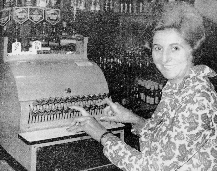 Mrs. June Hamilton, landlady of the Castle Inn, Conisbrough, rings up the price of a sale on the decimal currency till, which has been installed at the inn.