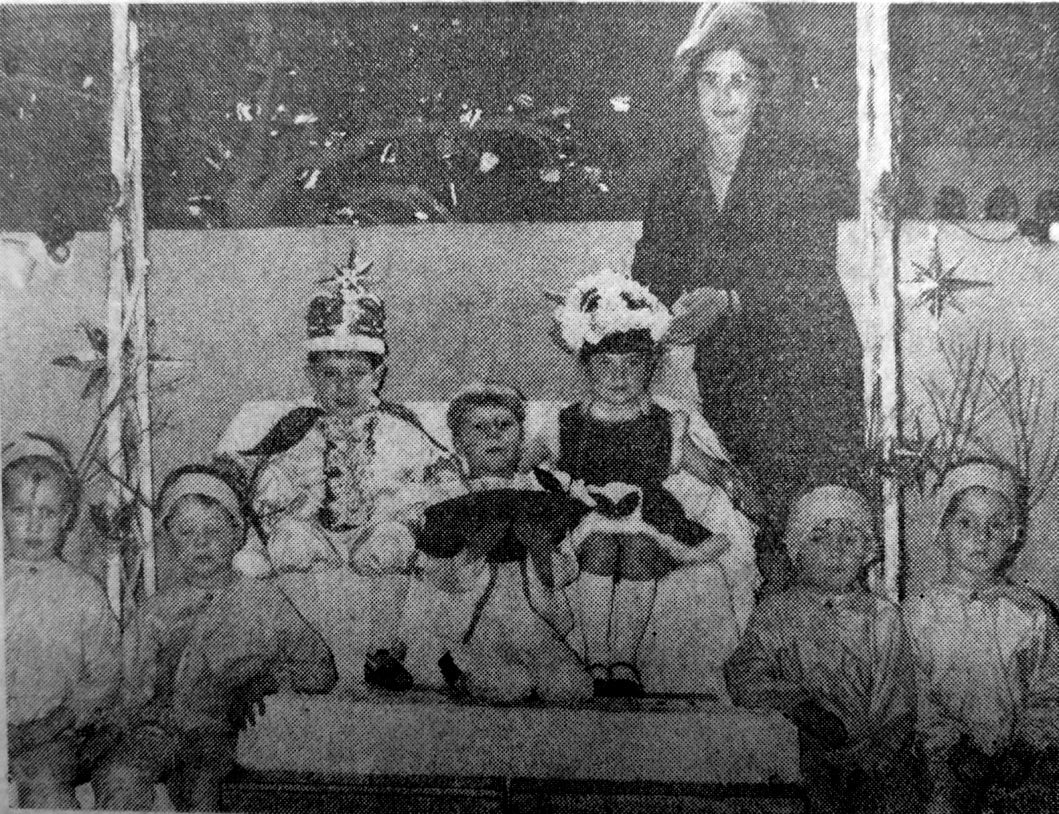 Mrs F Warren crowns Yvonne Craven and Thomas Mitchell Snow Queen and Snow King of Denaby Rossington Street infants’ School.