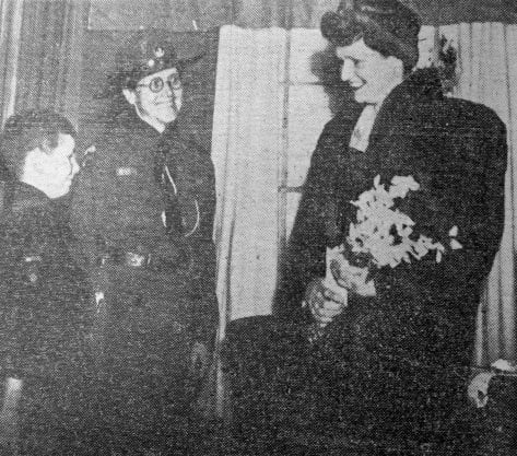 Mrs. Turner, wife of Major E. D. Turner, who is serving with the Eighth Army in Italy with George Cooper (who presented her with a bouquet) and Mrs. R. Cobb (Acting Cubmaster) after she had opened Mondays bring and buy sale.
