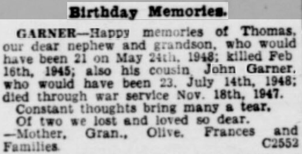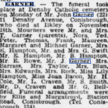 Son of Thomas and Alice Evelyn Garner, of Conanby, Conisbrough.