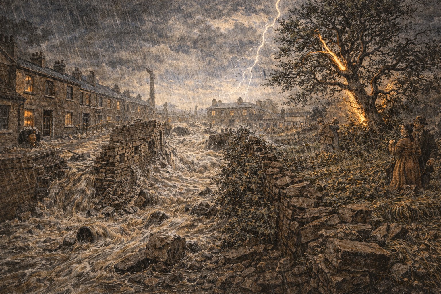 At Rothwell, near Leeds, during a terrible storm in the afternoon, James Hainsworth, engine-driver at a colliery, was killed by the lightning, and two companions were rendered insensible. Two men were killed by lightning at Royston, near Oldham, on Wednesday evening. They were engaged in constructing a reservoir when a heavy thunderstorm broke over them. Five men took shelter in a hut, which was struck by lightning, killing two and rendering the three insensible. In North Notts the electric fluid struck a stack of 30 sheep, causing extensive loss to the owner; while in other districts houses were damaged, cattle killed, and buildings set on fire. Growing crops were greatly damaged. Much rain fell on Thursday, but not to such an extent as the previous day.