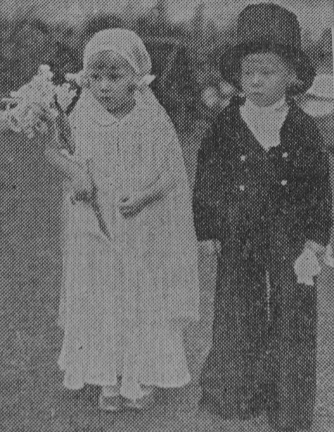 These little girls, Betty Peake, the “bride,” and Alice Horrocks, the “bridegroom,” each three years of ago, were easy winners of the fancy dress competition associated with the Denaby Hospital Sports on Saturday.