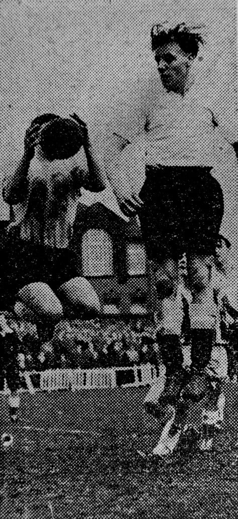 Sam Barker, Denaby Rovers goalkeeper, and a defender Leap high to save a corner Shot during the Montagu cup final at Mexborough on Monday, when Rovers met Denaby Tom Hill.