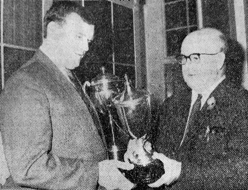 R. T. Sapey (left), captain of Denaby Tom Hill Old Boys’ Cricket Club, receives the Conisbrough C.C. Knock-out trophy and the Denaby and Cadeby C.C. Knock-out trophy from Mr. T. Salt at the club’s presentation evening on Friday.