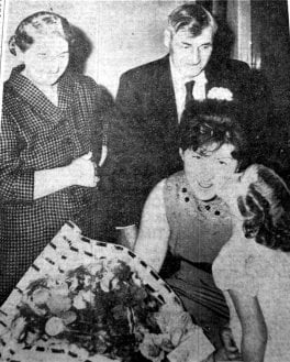 A kiss and a bouquet from her neice Laura for Miss Helen Turner of 16 Fullerton Avenue, Conisbrough who celebrated het 21st birthday with a party at the Welfare Hall