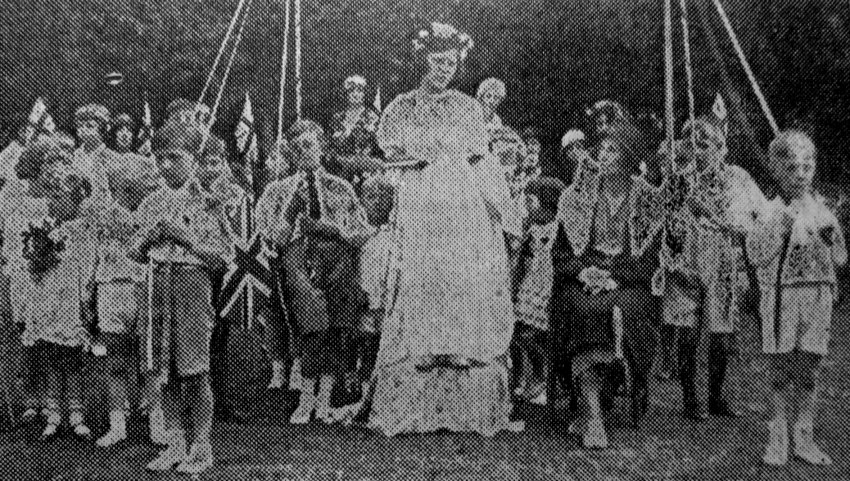 Dorothy Earnshaw, the village “Queen”, of Old Denaby, and some of her “court,” after the crowning ceremony, performed by Mrs. Somerset (wife of the vicar of Mexboro’), last Thursday.