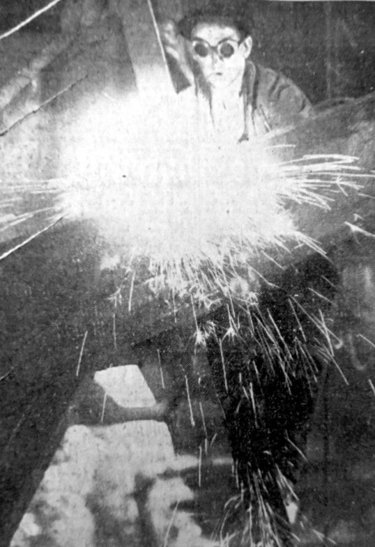 A workman on the Rainbow Bridge at Conisborough, cutting 12 inch cast iron girders with oxyacetylene cutter, which was specially made to call with this kind of metal.