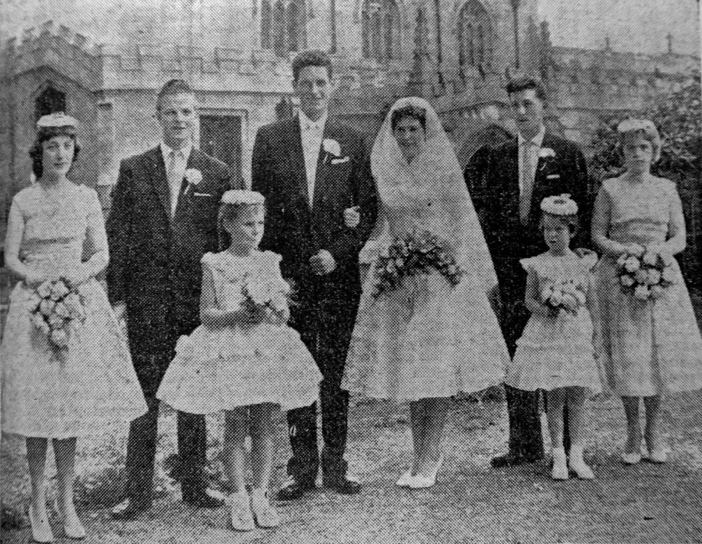 Miss Mary McInally Farrell, only daughter of Mr. and Mrs. W. Farrell, of 12, Maple Grove, Conisbrough, and Mr. James, Edward Holmes, youngest son of Mr. and Mrs A. Holmes of 9, Ivanhoe Road, Conisbrough, seen in a charming group after their wedding at St. Peter’s Parish Church.