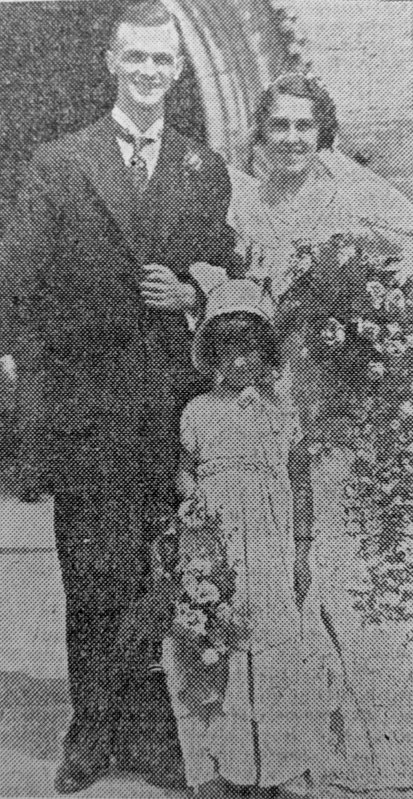The officiating clergyman was the Rev. J. Ellis Robinson. The bride wore a long white gown of cire lace with frills of organdie at the shoulders, and a crystal necklace pendant, and carried a bouquet of cream roses. She was given away by her father. A little niece of the bridegroom, Kathleen Day, wearing a dress of green crepe de Chine trimmed with frills and carrying a basket of flowers, was the bridesmaid. Mr. Ronald Merriman, brother of the bride, was best man and Mr. Clifford Merriman and Mr. Q. J. Trafford were the groomsmen.