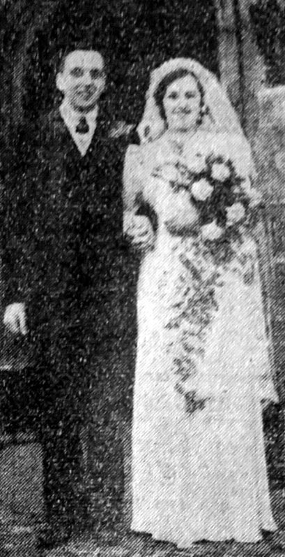 The bridesmaids were Miss Kathleen Denham, in green satin. Miss Avis Blunn in blue taffeta, with an overdress of net and Miss Joyce Wood, in gold taffeta. The maids all wore head-dresses to tone with their dresses and carried yellow chrysanthemums. They received gold signet rings from the bridegroom.