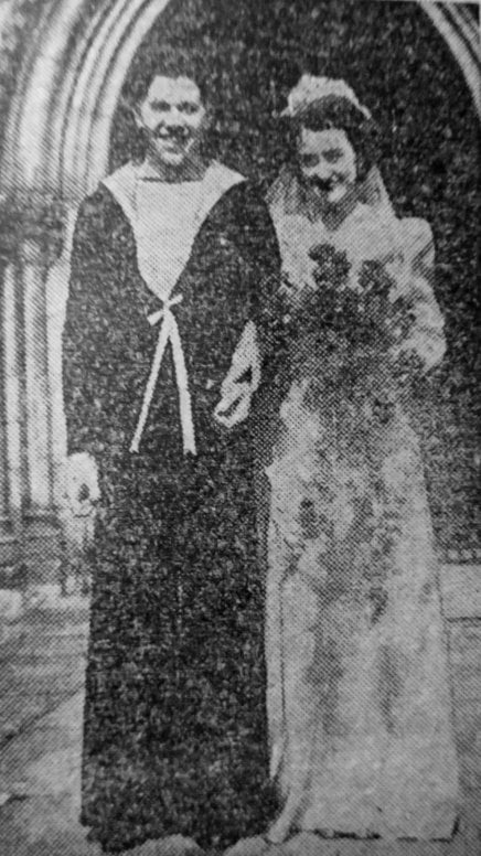 The bride was given away by her mother, and wore a dress of ice blue satin, with veil and carried red carnations and fern. She was attended by Miss Sylvia Etherington, and Miss Doris Bailey, in pink taffeta, with head-dresses to tone. Bridesmaids carried pink carnations.
