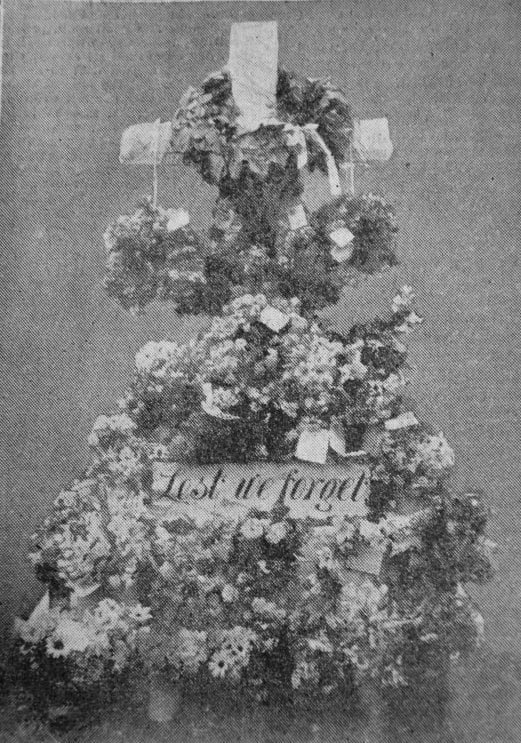 Upon the plinths in lovely profusion were laid a number of wreaths, and bunches of roses, lilies, and sweet peas – simple tribute to the lads who had fallen. The whole presented a most beautiful appearance, but constituted a poignant reminder of the great cost of victory. The laurel, wreath was provided by Brigadier General Sir Robert Bewicke-Copley, and wreaths received from sorrowing relatives and friends in memory of the fallen.